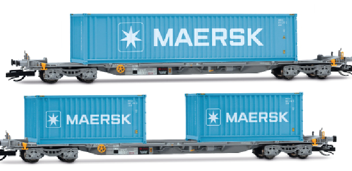 Arnold vient de nous annoncer un changement concernant le set de 2 wagons porte conteneurs chargés de conteneurs Maersk annoncés sous la référence HN9765 dans le dépliant des nouveautés France 2025 Arnold puisque les conteneurs ne seront pas gris (couleur historique des conteneurs Maersk) comme initialement annoncé, mais bleus avec marquages blancs (nouvelles couleurs des conteneurs Maersk) :