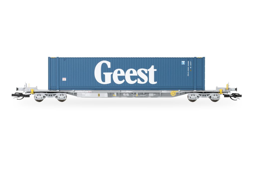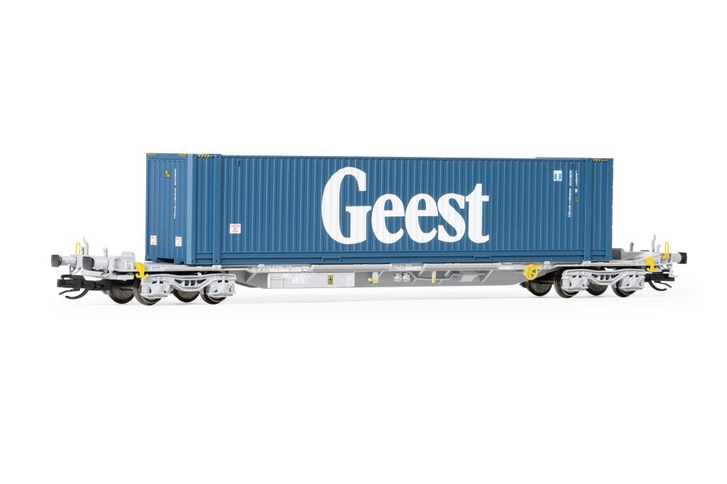Nous vous l’annoncions sur ce Blog il y a quelques semaines en vous écrivant que du matériel Honrby à l’échelle TT allait arriver dans la boutique en ligne TJ-Modeles, voici chose faite avec ce wagon porte-conteneurs Sffgmss en décoration conforme pour l’époque VI, chargé d’un conteneur hicube de 45″ aux couleurs du transporteur « Geest » (référence TT6033) que vous pourrez maintenant trouver également chez nous. Ce wagon porte-conteneurs surbaissé est propriété du loueur TOUAX et immatriculé en France. Autorisés à la circulation dans le tunnel sous la manche, les wagons porte-conteneurs de ce type sont utilisé pour relier l’Europe continentale (en particulier la France et l’Allemagne) au Royaume-Uni. En France, il n’est pas rare de croiser ce type de wagons dans tout l’hexagone.